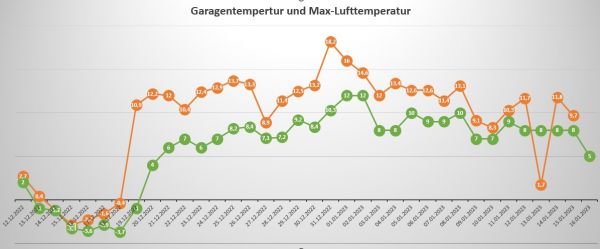 In dieser Grafik ist die Maximaltemperatur der Garage grün, die Maximaltemperatur draußen orange dargestellt.