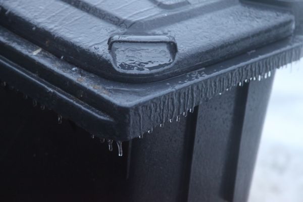 Gefrorener Mülleimer an der Wetterstation