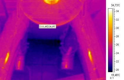 In diesen heißen Tagen können wir in unserem ca. 15 Jahre alten Gebäude in Bonn kühlen Kopf bewahren. Dank der 'Bodenklimaanlage' wird es in den Büros nicht wärmer als 25-26 Grad C und das ohne Klimaanlage. Durch eine Investition von ca. 500 DM wurden damals Ab- und Zuluftrohre in den Boden gelegt, die eine kontrollierte Lüftung des Gebäudes ermöglichten. So kann die Bodenkälte genutzt werden, um im Sommer zu extreme Temperaturen zu verhinden. Auf dem Infrarotbild ist ein großer Lüfter zu sehen, der die kühle Luft im ganzen Haus verwirbelt.