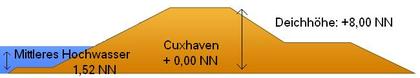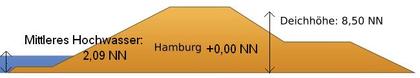 Wir sind gut gesichert, denn die aktuellen Deichhöhen (siehe Bilder) reichen weit über die zu erwartende Hochwasserprognosen für den kommenden Sturm hinaus. Eine Sturmflut wie 1976 oder 1962 können die Deiche von Wilhelmshaven bis Hamburg gut verkraften. Es wird zu Nikolaus ein Hochwasser von 4,5 bis 5 m über NN erwarte. Also keine Sorge an der Küste oder in Hamburg.