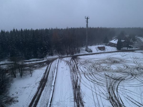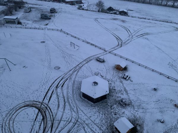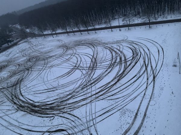 Spaß hört da auf, wo andere zu Schaden kommen: Die "Schneedonuts" auf dem  Sportplatz neben dem donnerwetter.de-Wetterpark in der hohen Eifel mögen dem ein oder anderen aus der Vogelperspektive vielleicht sogar als anschaulich erscheinen; die Schäden am Untergrund nach Driftaktionen wie diesen können aber immens sein.