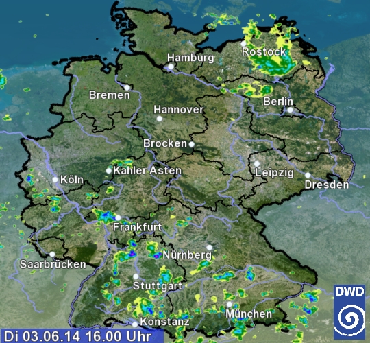 Auf dem Radarbild von 16 Uhr sieht man viele kleine Schauer- und Gewitterzellen. Im Radarfilm ist ihre Zugbahn erkennbar.
