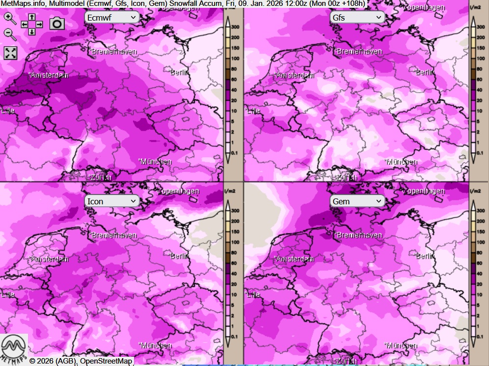 Einzelne Berechnungen zeigen sogar sehr strengen Frost (Temperaturen <= -15 Grad); etwa das europäische ECMWF-Modell, welches beispielsweise für den 18.01.2026 verbreitet zweistellige Minusgrade in Deutschland prognostiziert.