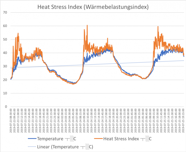 Auf dem Diagramm erkennt man zum einen die Lufttemperatur der letzten drei Tage und zum anderen den Heat Stress Index. Dieser wurde mittels der relativen Luftfeuchtigkeit in diesem Zeitraum berechnet. Die Gefahrenstufe lag somit in den letzten drei Tagen deutlich im "roten Bereich". Hitzschlag, Hitzekollaps und Sonnenstiche waren demnach nicht auszuschließen.