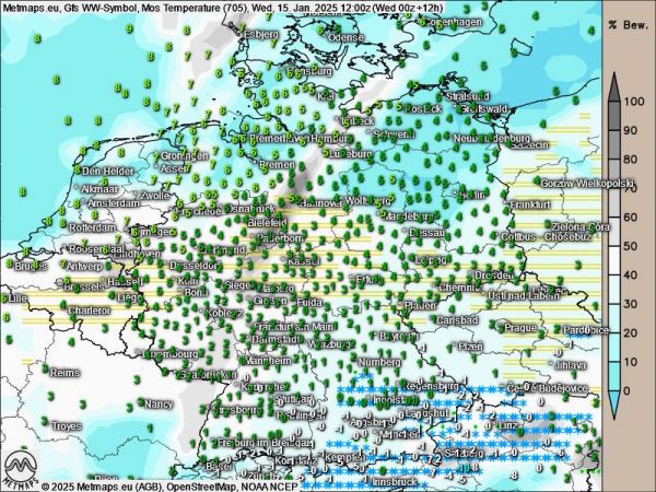 Nun erreicht die Warmluft die Alpen - meist ist es in Bayern und Baden-Württemberg eine Mischung aus Schnee und Regen, die aus der Wolkenmasse fältt. Bitte seid heute früh sehr vorsichtig, es kann noch ziemlich rutschig sein.