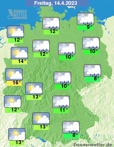 Die Temperaturen erreichen in der Spitze Werte um 8 Grad im Berchtesgadener Land, 12 Grad an der Weser und 16 Grad im Rheinland.