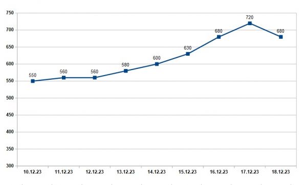 Die Grafik zeigt den möglichen mittleren Pegelverlauf aller Varianten am Beispiel des Pegels Bonn für den Zeitraum 10. bis 18.12.