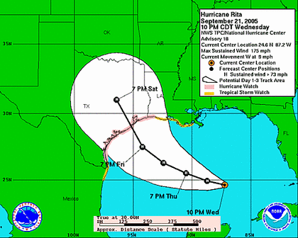 Satellitenbild von Donnerstag morgenNach Angaben des Nationalen Hurrikanzentrums der USA erreichte 'Rita' bereits Windgeschwindigkeiten von über 280 Stundenkilometern und wird damit auf der Hurrikan-Skala in der höchsten Kategorie 5 eingestuft. Nach den aktuellen Prognosen wird der Hurrikan zwischen Galveston und Freeport auf Land treffen.