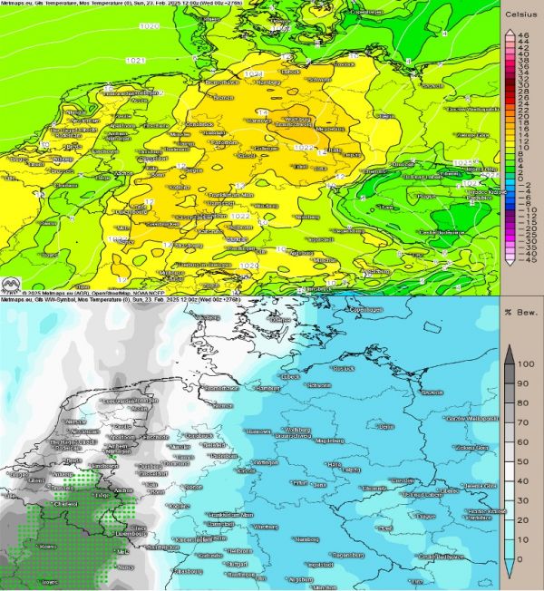 Die beiden folgenden Karten zeigen die Lufttemperaturen und das allgemeine Wetter für den 23.02.2025 (12:00 Uhr) nach ECMWF.