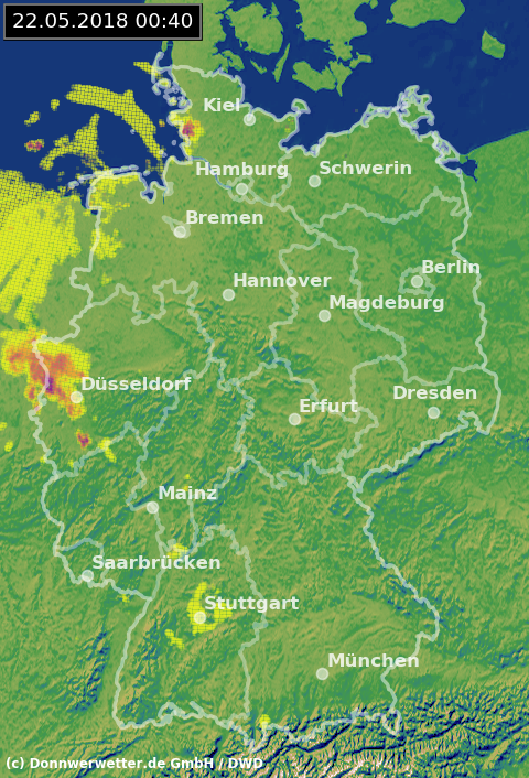 Das Radarbild zeigt aktuell im Rheinland noch stärkere Signale mit Regen, die Richtung Norden ziehen. Zum Teil blitzt und donnert es hier auch noch. Die Signale im Nordseeumfeld deuten nicht auf Niederschlag. Sonst präsentiert sich der Himmel im Südwesten und Westen unseres Landes teilweise bewölkt, sonst jedoch vielfach sternenklar.