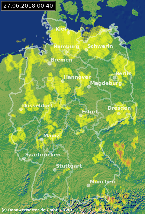 Das Radarbild zeigt aktuell schwache Signale, um Niederschlag handelt es sich dabei allerdings in der Regel nicht. Nur über Thüringen hat es vereinzelt etwas geregnet. Über Tschechien und Österreich erkennt man einige Schauersignale, die auch das Berchtesgadener Land treffen können. Sonst präsentiert sich der Himmel über Deutschland oft sternenklar und nur regional bewölkt.