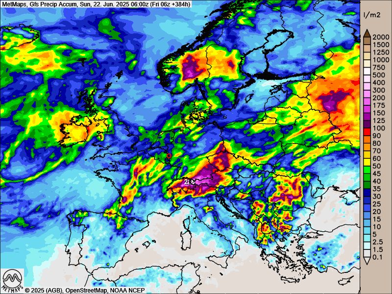 Die beiden Karten bilden die Regenmengen für Europa nach dem US-Modell GFS und dem europäischen Modell ECMWF bis zum kalendarischen Sommeranfang am 21.06. bzw. 22.06. ab - mit vielen Westlagen bleibt es bis dahin häufig nass.