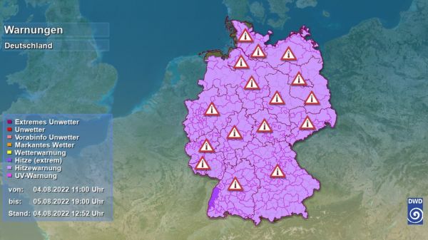 Für weite Teile Deutschland besteht darüber hinaus eine amtliche Warnung des Deutschen Wetterdienstes vor Hitze; ausgenommen hiervon sind allein die Regionen unmittelbar an Nord- und Ostseeküste.