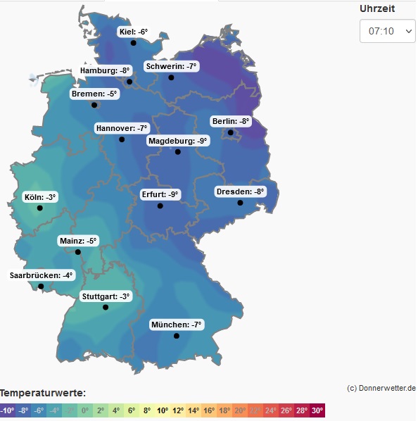 Mit eisigen Temperaturen geht es heute auch in den Dienstag - wie die Temperaturkarte unseres Nowcastings zeigt, sind die tiefsten Temperaturen heute früh vor allem in der Ost- und Nordosthälfte aber auch in Schleswig-Holstein zu finden. Vor allem in den schneebedeckten Höhenlagen sind in diesen Nächten auch Tiefstwerte deutlich unter -10 Grad möglich.