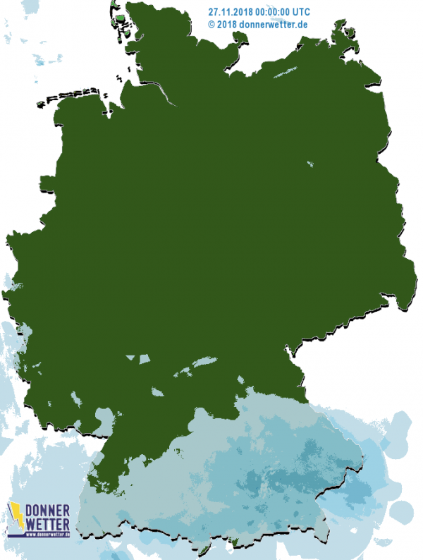 Das Radarbild zeigt aktuell keine Signale mit Niederschlag. Erst zu Tagesbeginn nähert sich allmählich von Westen eine schwache Regenzone. Sonst präsentiert sich der Himmel über Deutschland im Süden eher wolkenverhangen im Norden gebietsweise aufgeklart. Im Süden haben sich einige Nebelfelder gebildet.