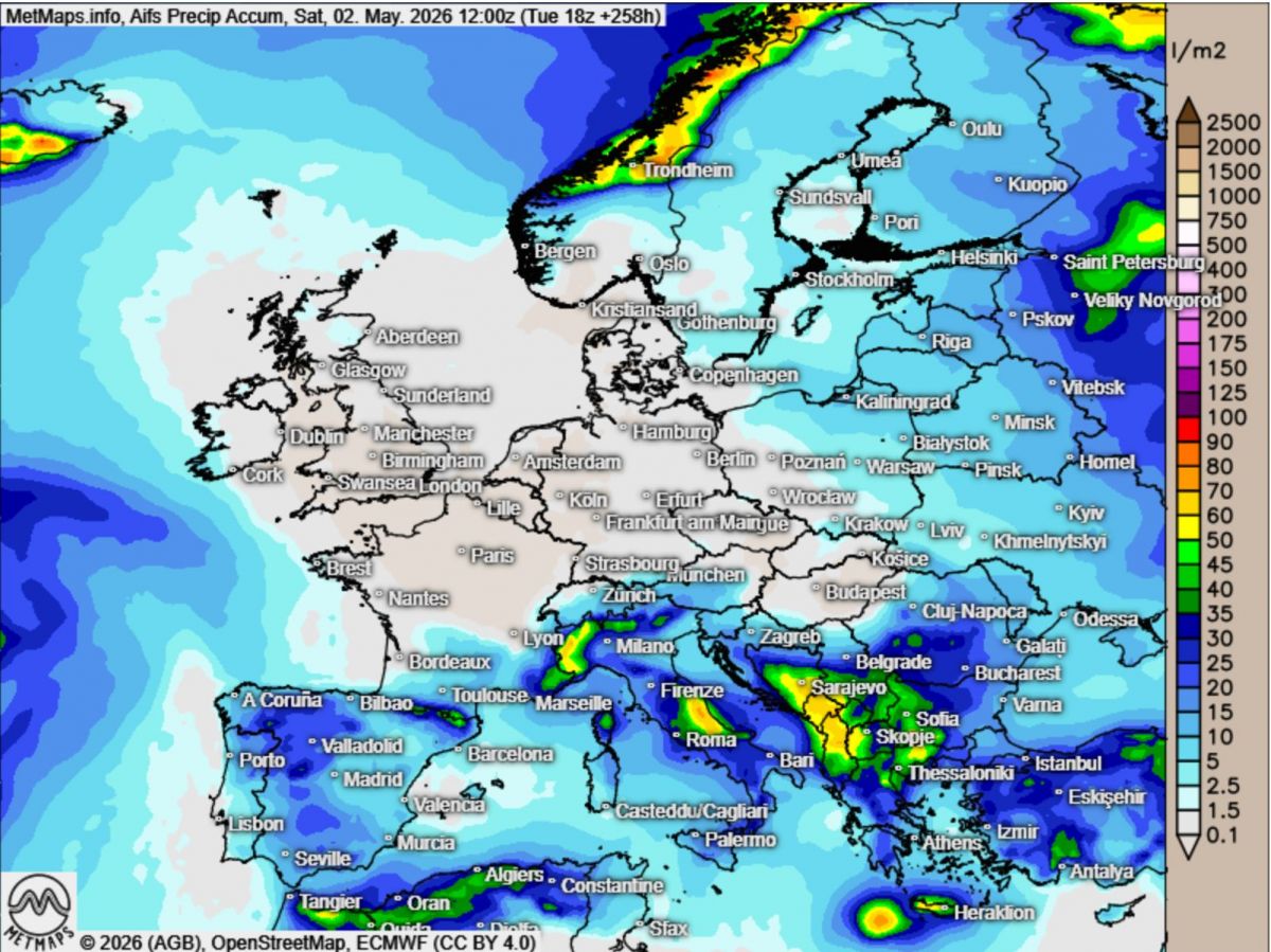 Akkumulierte Regenmengen Europa bis 02.05. nach AIFS