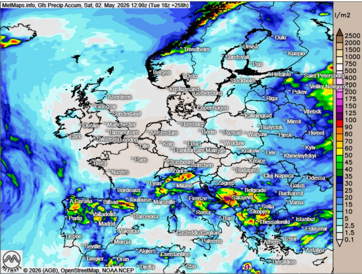 Besonders auffällig ist das sogenannte "Regenloch", das sich auf den aktuellen Prognosekarten abzeichnet. Es erstreckt sich als breiter Korridor von den Britischen Inseln über die Benelux-Staaten und Deutschland bis weit nach Polen hinein. In diesem Bereich zeigen die Modelle bis zum 2. Mai 2026 praktisch keine nennenswerten Niederschlagssignale.