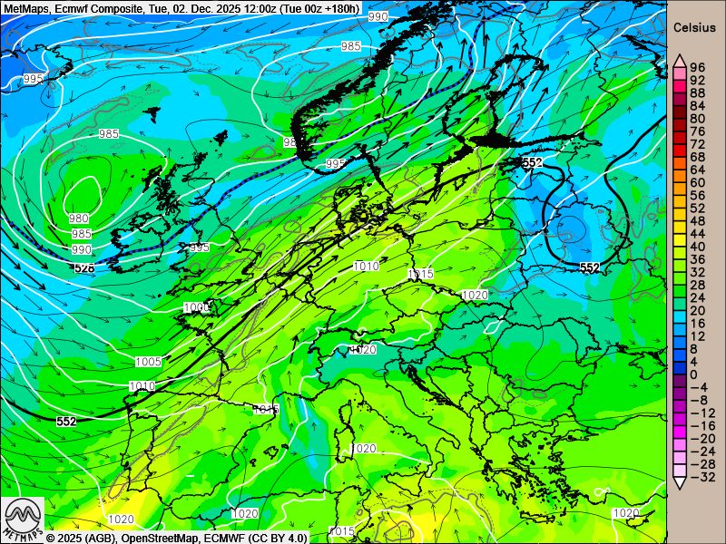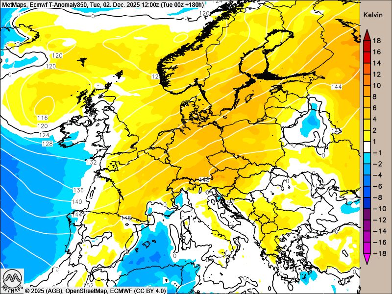 Die Strömungskarte sowie die Temperaturanomalie nach ECMWF für Anfang nächster Woche mit dem Südwest-Express über Europa: