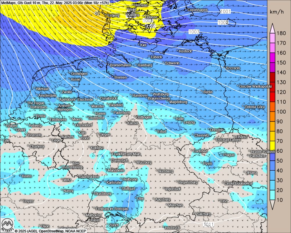 Ab morgen bringt ein kleines Tief dann Sturmböen für die Nordseeküste. Im Süden muss dann häufiger mit Schauern und Gewittern gerechnet werden. Zu sehen ist die Böenkarte für den Donnerstag nach GFS.