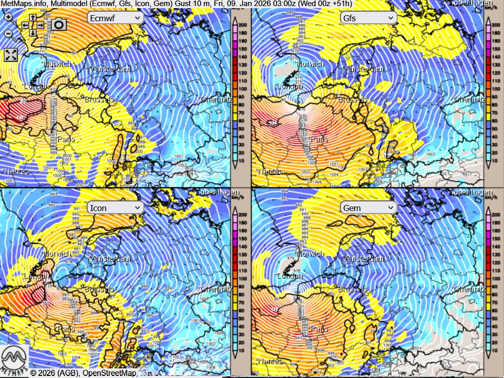 Die Böenkarten für den 09.01.2026 / 03:00 Uhr (ECMWF, GFS, ICON, GEM) im direkten Vergelich