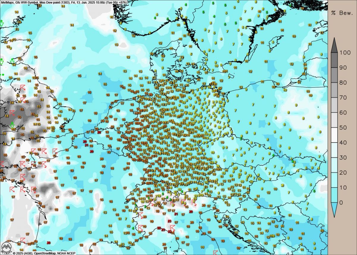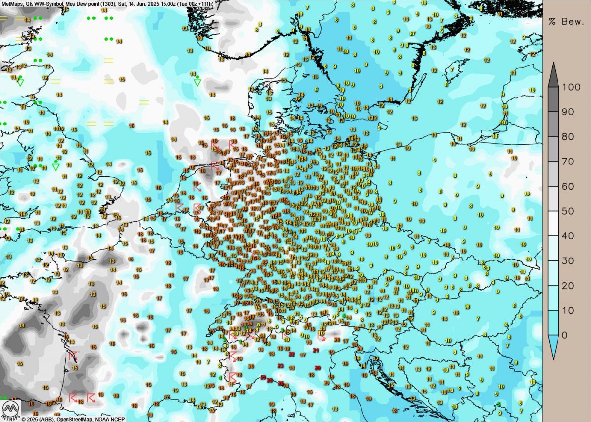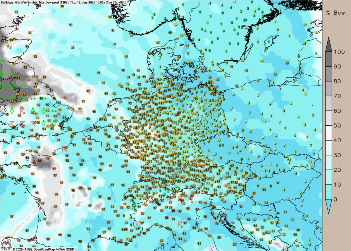 Nachfolgend die Entwicklung des Wetters sowie der Taupunkttemperaturen von Mittwoch bis Samstag - die Taupunkttemperaturen legen in diesem Zeitraum einen Anstieg von 10 Grad hin - klebrig-schwitziges Waschküchenwetter ist also vorprogrammiert.