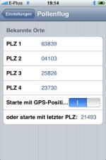 Hinter jeder Kurzwahl der App können Sie in den Systemeinstellungen eine beliebige PLZ hinterlegen und durch drücken des jeweiligen Knopfes bekommen Sie den Pollenflug für diesen Ort angezeigt. Dauerhaft speichern können Sie die PLZs in den Einstellungen ihres iPhones/iPods.