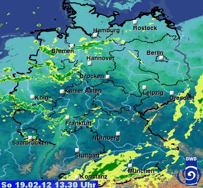 Das Radarbild am Sonntag Mittag zeigt im Nordwesten Schauer. Ausgelöst durch die kältere Luftmassen, fallen die Niederschläge teils als Regen, teils als Schnee.