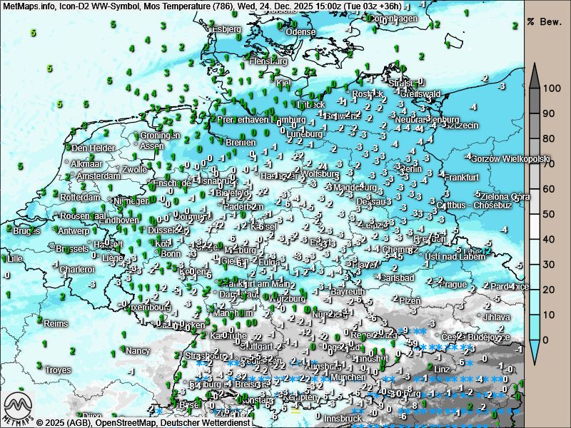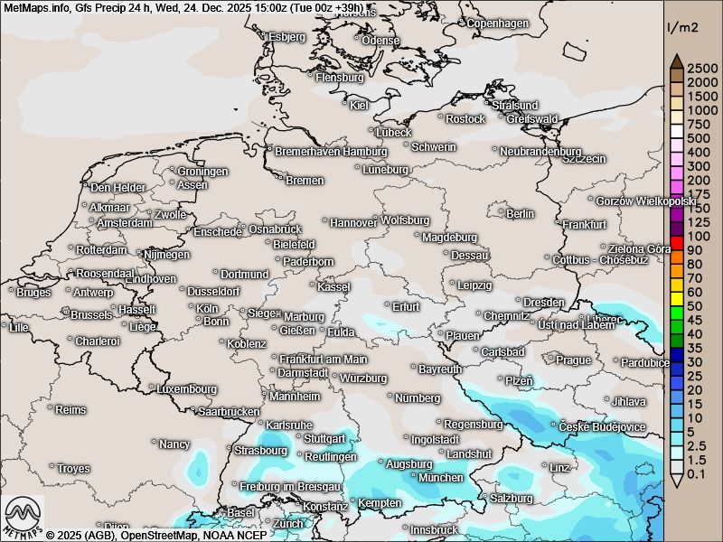 Die Böenkarte für Dienstagnachmittag (15:00 Uhr), die 24-Stunden-Regenmengen bis zum 24.12. (15:00 Uhr) sowie die Wetter- und Temperaturkarte für Heiligabend (15:00 Uhr) nach GFS: