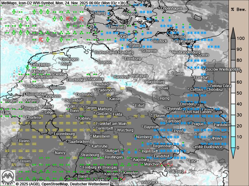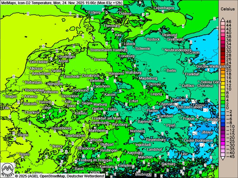 Die Wetterkarten für Montagfrüh und -nachmittag sowie die Temperaturkarte für 15:00 Uhr nach Icon: