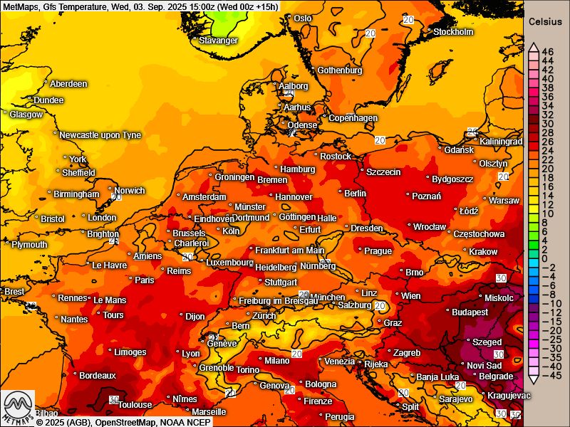 Lufttemperaturen MIttwochnachmittag, 15:00 Uhr