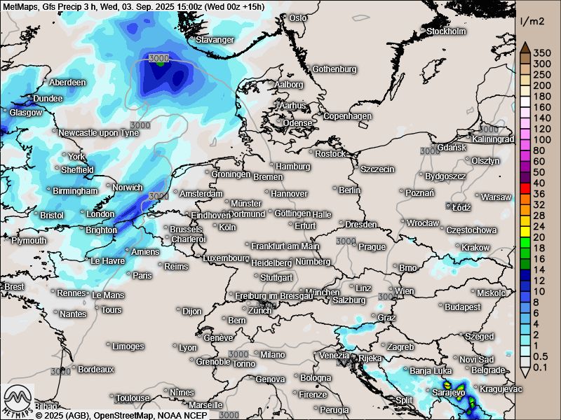 Drei-Stunden-Regenmengen bis MIttwochnachmittag, 15:00 Uhr