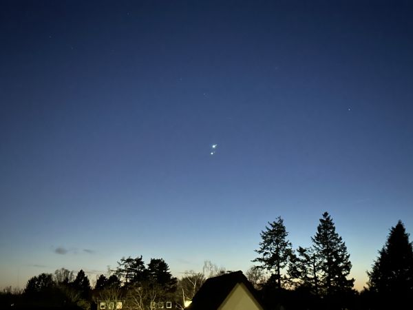 In den kommenden Tagen wird sich der Abstand zwischen dem Gasplaneten Jupiter und dem Gesteinsplaneten Venus wieder vergrößern. Am 26.03. wird sich das die Sichel des zunehmenden Mondes zwischen die beiden Himmelskörper schieben.