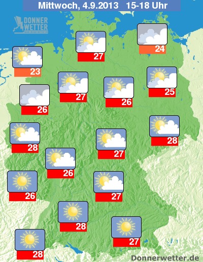 In Baden-Württemberg bis nach Nordrhein-Westfalen sind am Dienstag schon wieder Temperaturen um 25 Grad möglich. Am Mittwoch wird es dann auch im Rest Deutschlands wärmer, so dass sommerliche Temperaturen um 26 bis 28 Grad möglich sind:
