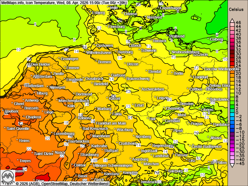 SONNE - viel rot auf der Karte ---- heute und morgen häufig um die 20 Grad C im Westen und