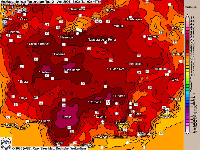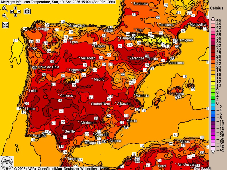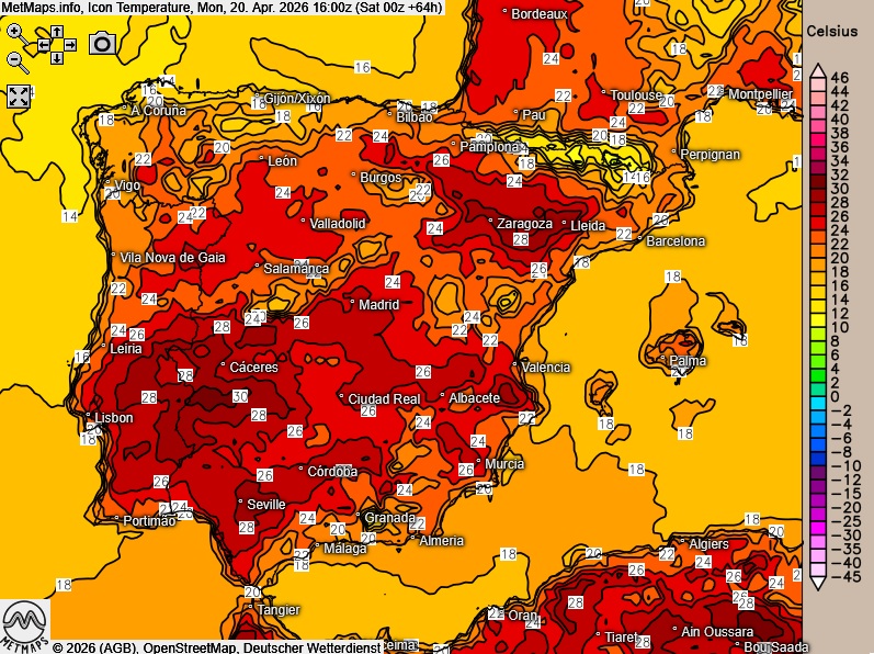 Auch zu Beginn der kommenden Woche bleibt es in Teilen Spaniens sehr heiß. Vor allem im Süden des Landes – etwa rund um die Metropolen Sevilla und Córdoba – sind am Dienstag sogar Spitzenwerte um 32 Grad möglich.