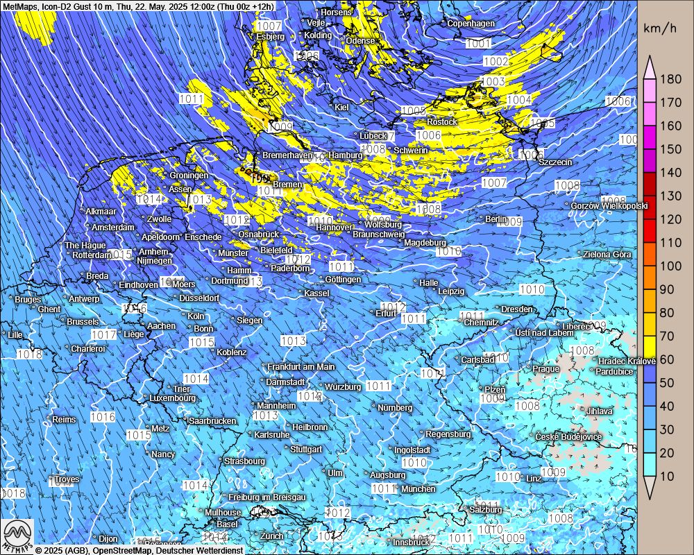 Dazu weht ein frischer bis stürmischer Wind; direkt an der See und in Schauern muss auch mit Sturmböen (Windstärke 9) gerechnet werden. Vor allem belaubte Bäume sind gefährdet, da sie dem Wind eine größere Angriffsfläche bieten.