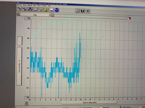 Wie rapide die Luftfeuchtigkeit binnen kurzer Zeit abfallen kann, zeigt die Kurve von Mittwochmorgen: Betrug die Luftfeuchtigkeit gegen 08:30 Uhr noch 100 Prozent, waren es eine Stunde später bereits nur noch 62 Prozent. Im weiteren Tagesverlauf wird sie erneut auf Werte um 40 Prozent absinken. Und auch der Wind bleibt in Sachen Waldbrandrisiko erst einmal ein ständiger und unbequemer Begleiter.