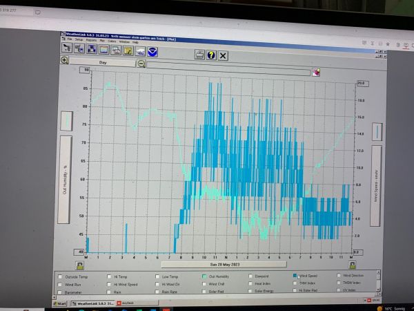 Unsere Wetterstation in der hohen Eifel, unweit von der Brandstelle entfernt, dokumentierte am Sonntagabend eine Luftfeuchtigkeit (hellblaue Linie) von unter 45 Prozent. Mit anderen Messgeräten konnten wir in ungünstigeren Lagen sogar Tiefstwerte von 20 Prozent messen. Hinzu kamen am Sonntagabend, der Brand begann voraussichtlich zwischen 17 und 18 Uhr, Windspitzen um die 20 km/h, die die Flammen zusätzlich anfachten.