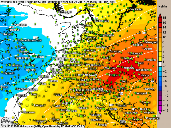 Die Temperaturanomalien in Kelvin nach ECMWF für den Samstag (15:00 Uhr):