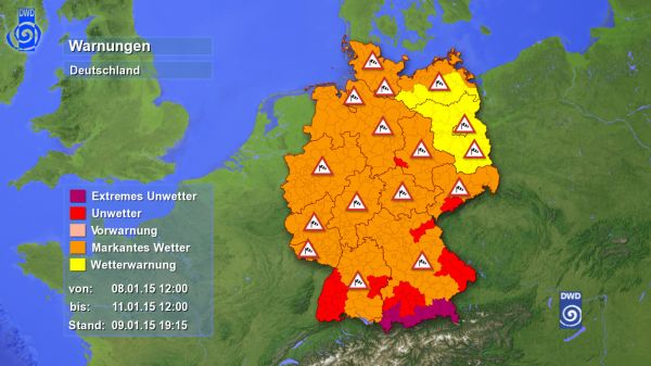 Nachts im Westen und Norden orkanartige Böen in den Mittelgebirgen. Im Flachland bis zu 100 km/h. Morgen weitere Böen im Tagesverlauf im Westen und Norden. Es bestehen Unwetterwarnungen.