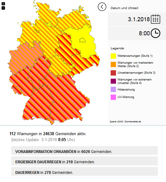 Die Westhälfte des Landes hat das Hauptsturmgebiet überstanden, in den kommenden Stunden liegt der Schwerpunkt auf der Südwesthälfte. In Baden-Württemberg und Teilen Bayerns können dann mit Durchzug der Kaltfront örtlich schwere Sturmböen, regional auch Orkanböen auftreten. Um die Mittagszeit erreicht das Sturmfeld den Alpenrand.