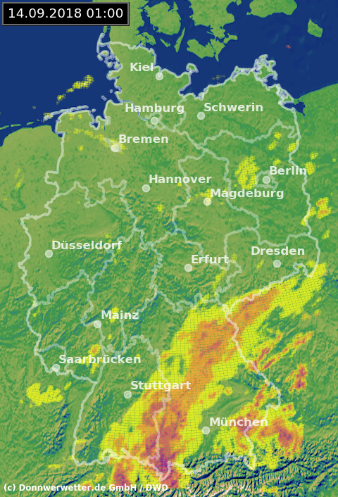 Heute kann es vor allem im Südwesten, in den östlichen Mittelgebirgen und südlich der Donau noch zu örtlichen Regengüssen und einzelnen Gewittern kommen. Die Niederschlagsmengen liegen dabei allgemein zwischen 1 und 10 Liter pro Quadratmeter, vereinzelt auch mehr. Sonst bleibt es überwiegend trocken.
