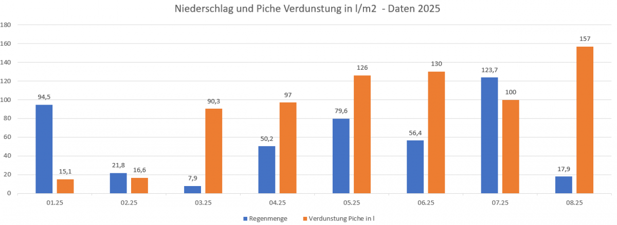 Wasserbilanz in l Januar bis August 2025 an unserer Wetterstation in Bonn (Regenmenge blau, Verdunstung orange)