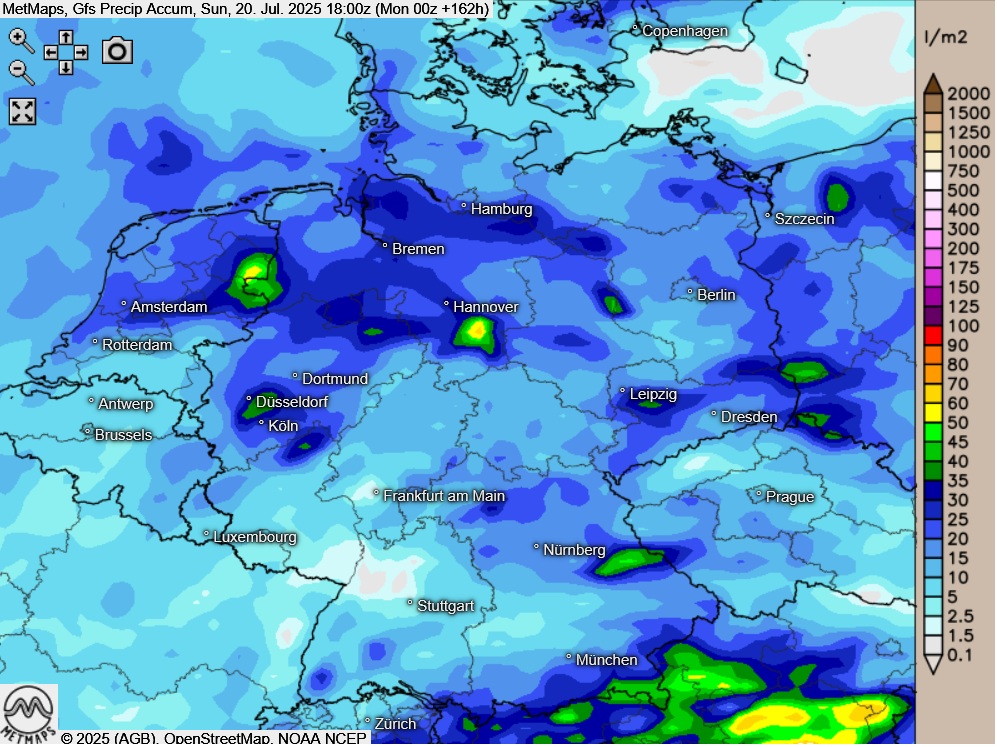 Trotz wechselhaften Juliwetters, welches in dieser Woche immer wieder teils kräftige Schauer und Gewitter im Gepäck hat, dürften die Gesamtregenmengen bis Ende der Woche insgesamt überschaubar bleiben.