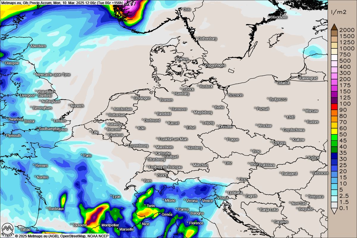 Stabiles Hochdruckwetter begleitet uns bis in die kommende Woche hinein - das US-amerikanische GFS-Modell rechnet bis einschließlich kommenden Montag mit keinerlei Niederschlägen in Zentraleuropa. Im Laufe der nächsten Woche kann es dann laut GFS im Süden Deutschlands Niederschlagsmengen um 5 l/m² geben, andere Modelle zeigen den spärlichen Regensegen für den Süden aber nicht.