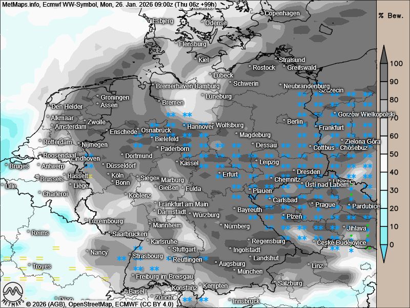 Während durchweg alle Modelle den Süden und Osten zu Montag mit 5 bis 10 cm "einpudern", gehen EMCWF und GFS auch von Schnee im Westen und in der Mitte aus - hier sollen 1 bis 3 cm fallen. Bitte denkt daran am Sonntagabend und Montag mehr Zeit einzuplanen.