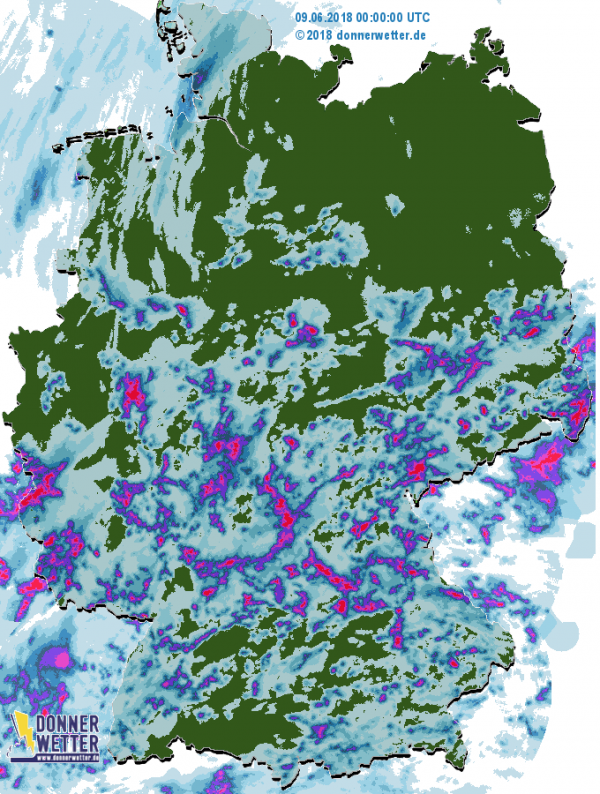 Das Radarbild zeigt aktuell vor allem am Mittelrhein und an der holländischen Grenze zum Teil kräftige Schauer und Gewittersignale, die langsam nach Norden wandern. Sonst sind die meisten schweren Gewitter in sich zusammen gefallen. Der Himmel über Deutschland präsentiert sich teils wolkenverhangen, teils aufgeklart. Vereinzelt haben sich im Südwesten Nebelfelder gebildet.