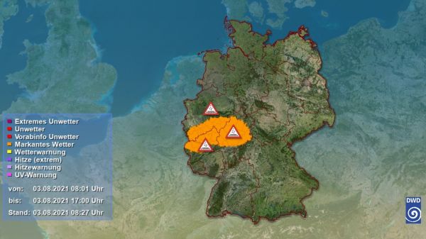 Aktuell sind Wetterwarnungen des Deutschen Wetterdienstes vor Starkregen aktiv - betroffen sind vor allem der Süden NRWs, das nördliche Rheinland-Pfalz sowie weite Teile Hessens.