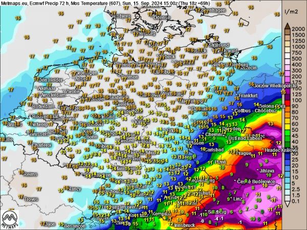 Nach ECMWF-Modell ist in den kommenden 72 Stunden in Österreich, Tschechien und Südpolen mit Regensummen von 200 bis 250 l/m² zu rechnen. Dauerregen und starken Schneefall gibt es zudem in den Alpen.