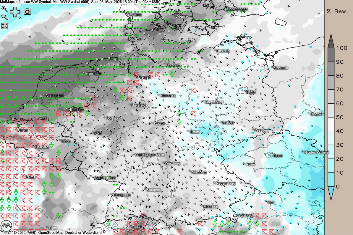 Bewölkung und Temperaturen am 1. Mai (15:00 Uhr)